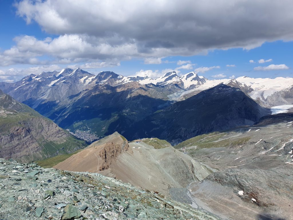 Tief im Tal erblickt man die Seitenmoräne des Zmuttgletschers