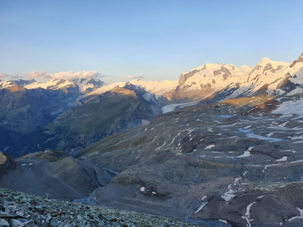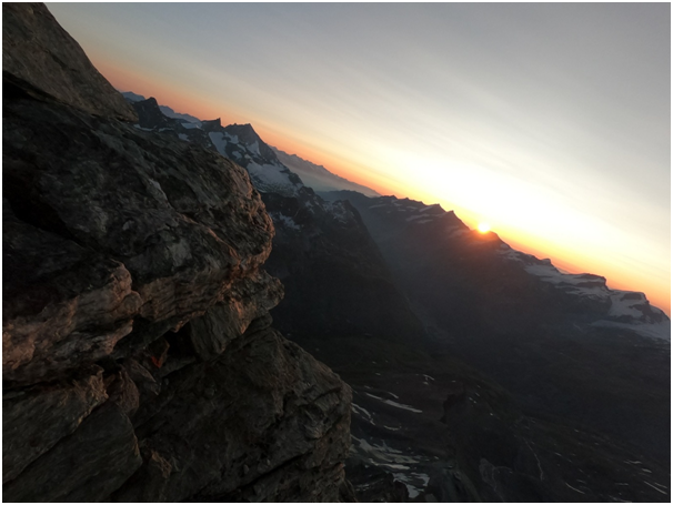 Die Stimmung in der modernen Hütte auf 3260 m hatte wenig von einer gemütlichen Alpenhütte – nicht wegen der fehlenden Gastfreundschaft (im Gegenteil, wir wurden sehr freundlich empfangen und köstlich bewirtet). Aber es ging eine nervöse Anspannung von den (oftmals ziemlich bärtigen) Bergsteigern aus, die sich wie ein Teppich über die Stimmung legte. Es waren viele unterschiedliche Nationen und Altersgruppen vertreten; Schweizer, Italiener, Franzosen, Deutsche…insgesamt aber sehr wenige Frauen. Wir schauten uns die Einstiegsstelle und die ersten paar Meter am Berg spätnachmittags bei einem 30 minütigen Erkundungstrip an, damit das morgen bei Dunkelheit etwas leichter von der Hand ging. Ab 21 Uhr war Schlafenszeit – obwohl draußen noch die Sonne schien! Den Vollbärten in meinem Mehrbettzimmer schien das nichts auszumachen – sie schnarchten bald vor sich hin. Schlafen war für mich angesichts des bevorstehenden Abenteuers quasi unmöglich.