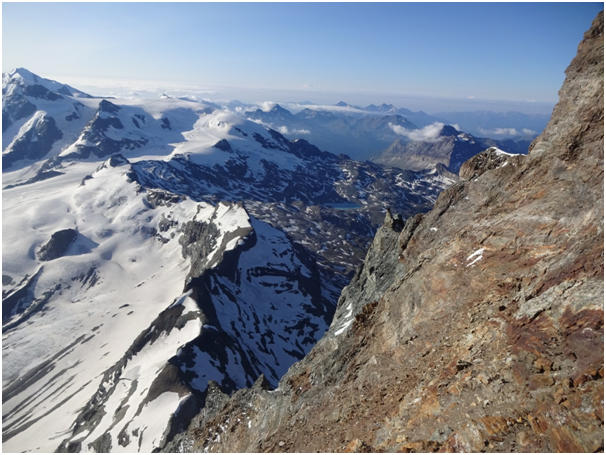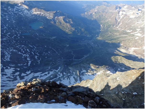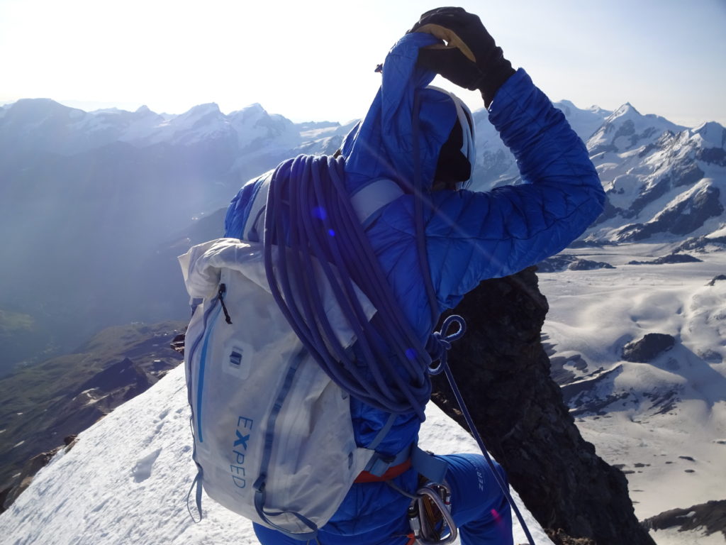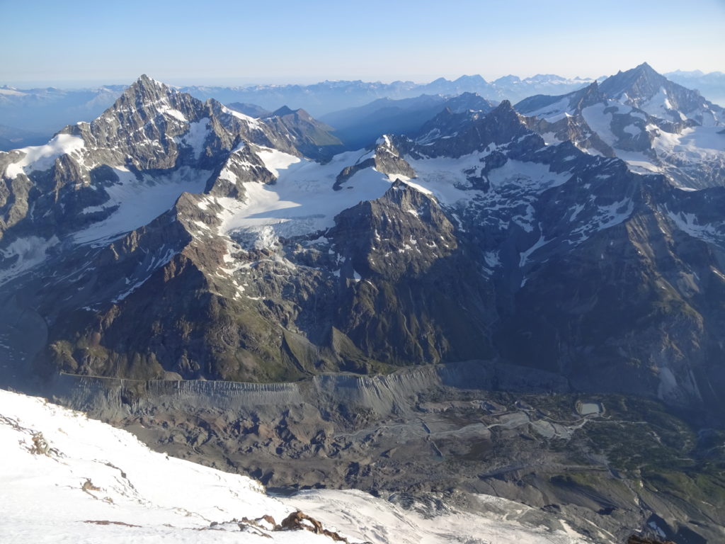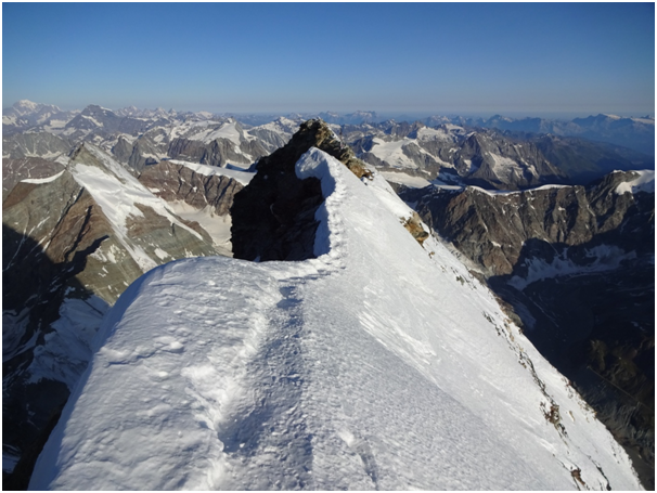 Es wehte allerdings ein scharfer, eisiger Wind, deswegen wurden die Fotos so schnell wie möglich gemacht. So also sieht das „Toblerone“ Model oben aus! Ein auf natürliche Art sorgsam ausbalanciertes Spitzdach aus Fels und Schnee. Wir hatten dabei eine spektakuläre Weitsicht entlang der Ost-West Achse über das Alpenpanorama. Rechts ein steiler Abgrund aus eisigem Schnee (Nordseite), auf dem man, einmal ins Rutschen gekommen, keine Chance hätte anzuhalten. Links (Südseite), direkt neben der schmalen Spur im Schnee auf dem Grat Richtung italienischer Gipfel, konnte man gar keinen Hang erkennen. Der ging so abrupt abwärts, dass man sich runter beugen müsste, um ihn direkt zu sehen. Nur eine scharfe, schroffe Felskante stellt den natürlichen Schlussstein des Berges dar. Es war seltsam, nach all den Anstrengungen plötzlich oben zu sein – und nicht mehr weiter hoch zu können. Es war vollbracht, ich war ganz oben. Auf 4478 m Höhe, dem zwölfthöchsten und einem der schwierigsten Gipfel der Alpen.
