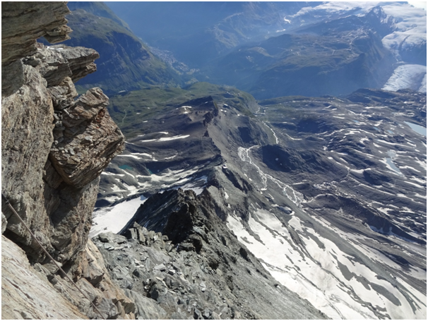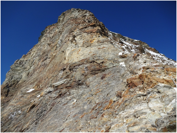 Die Hände in den Handschuhen im stetigen Kontakt mit dem kühlen, scharfen Fels; der Berg, ein Urgeschöpf der Kontinentalplattentektonik, die mit unerbittlichen Kräften die Alpen erschaffen hat. Am Matterhorn (überwiegend Gneis) ist man auf den letzten Überbleibseln des „afrikanischen Kontinents“ unterwegs, der vor ca. 250 Mio Jahren in die eurasische Platte geschoben wurde, wobei sich unter anderem das Matterhorn auftürmte. Man begegnet einem sehr vielfältigen Farbspektrum: rotes, gelbes, schwarzes, und grünes Gestein; vor allem Letzteres dem einstigen Ozean „Thetys“ zugehörend.