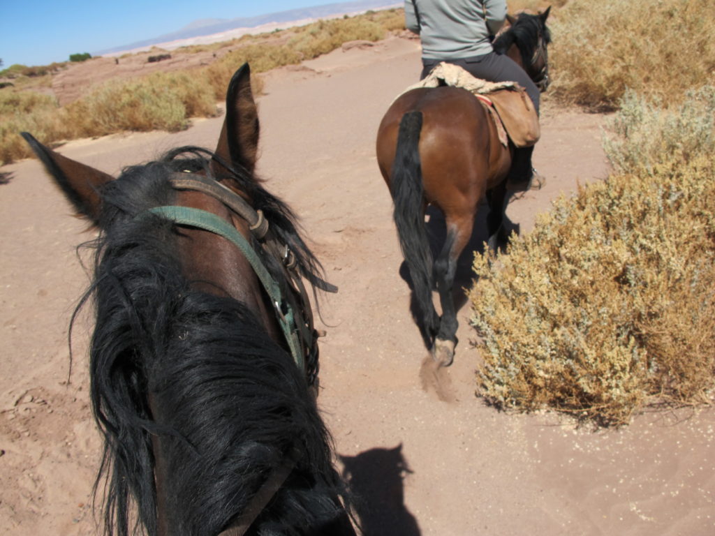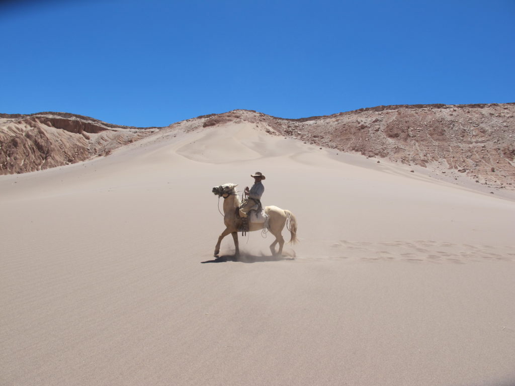 In unterschiedlichsten Tempi, die man von einer Reithalle gar nicht kennt, bewegen wir uns durch die felsige und weite Landschaft. Die Pferde sind trittsicher, und passen sich dem Untergrund an. Wir sitzen bequem in den Fellen der Sättel. Echter kann der Wilde Westen auch nicht sein! Bequem machen ist nicht – man muss aktiv im Sattel mitarbeiten. Gewicht verlagen, treiben, lenken, mitschauen. Wenn es steile Dünen hochgeht, muss das Gewicht weit nach vorne verlagert werden; wenn es steil abwärts geht, nach hinten.
